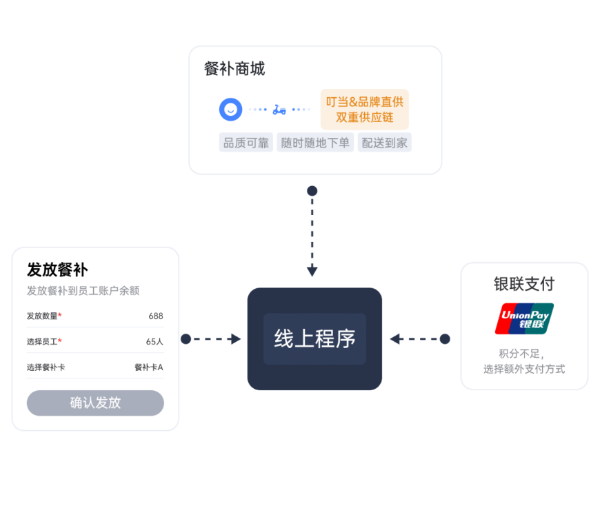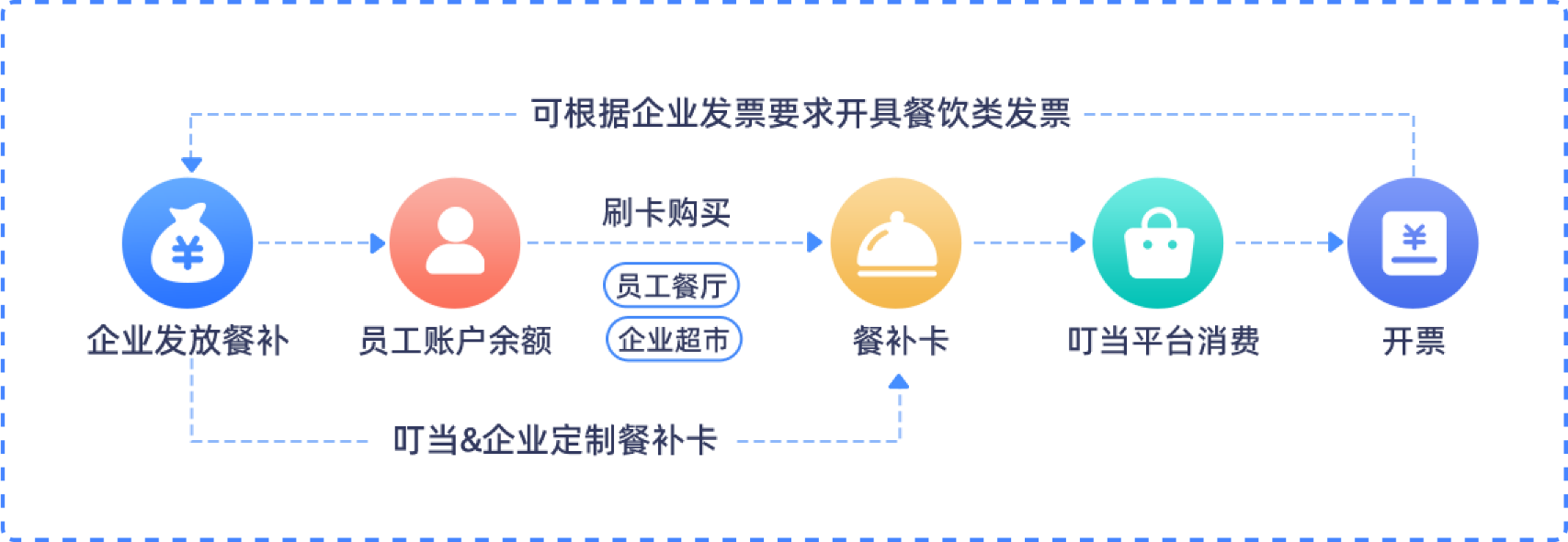 企业利用叮当平台发放餐补积分,或员工在线下用饭卡余额兑换等价餐补卡来获取登录权限